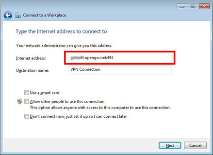 Copy the "Hostname for SSTP Connection" (an identifier ends with ".opengw.net" or the port number) and paste it on the "Internet address" field on the configuration wizard.